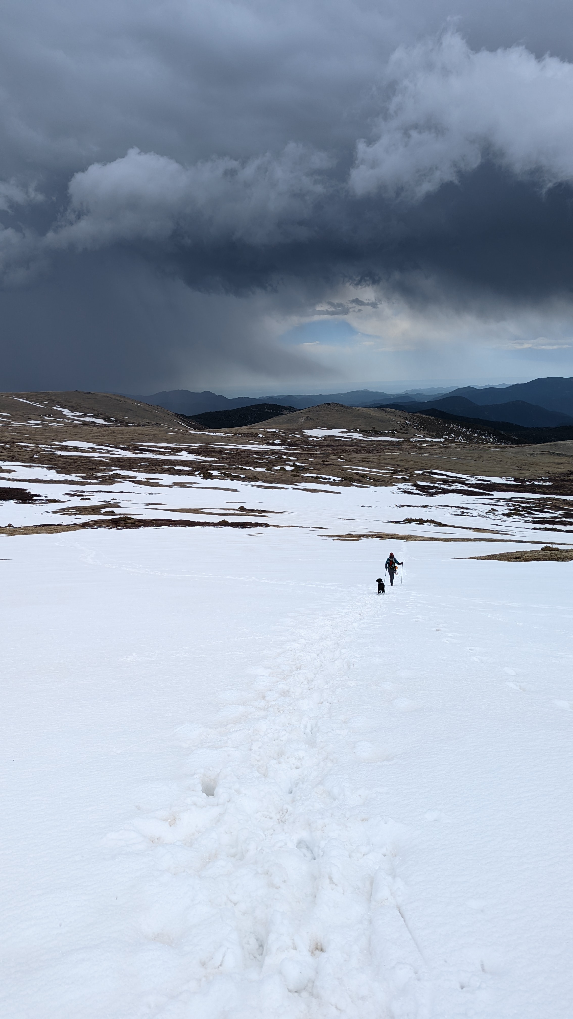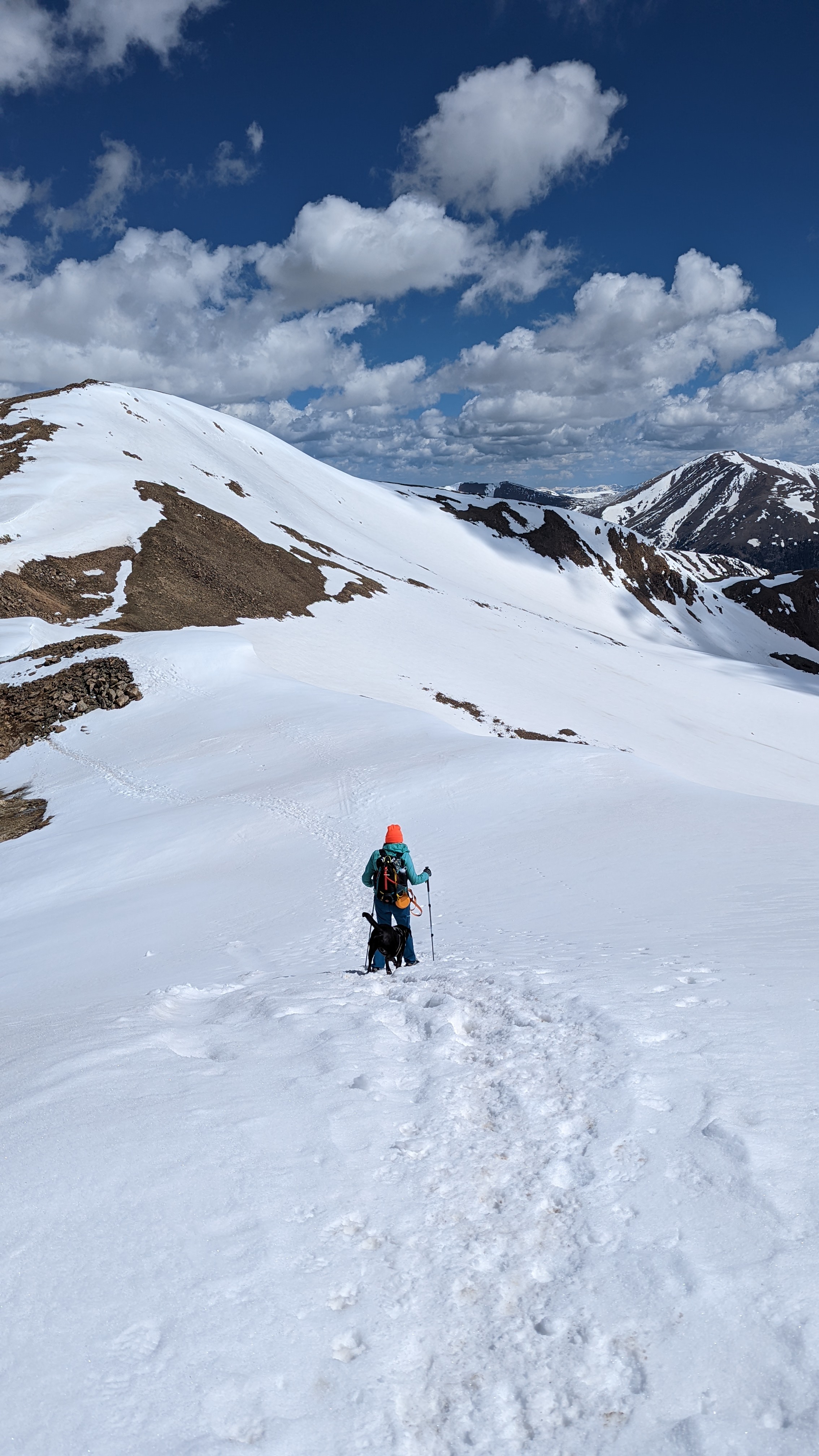 9/10 • Our first 13er! We set out to get both Cupid (13,117) and Grizzly (13,334) but the pass between the two was a bit too difficult for Franklin to navigate, mainly because there was so much snow we had to go around. I would absolutely come back and do this again with better conditions. Difficulty – hard