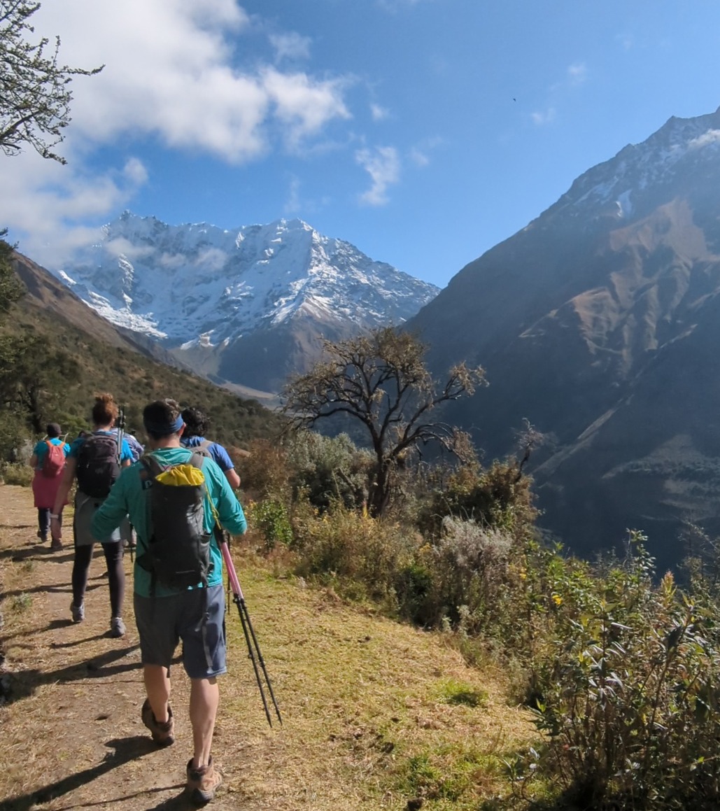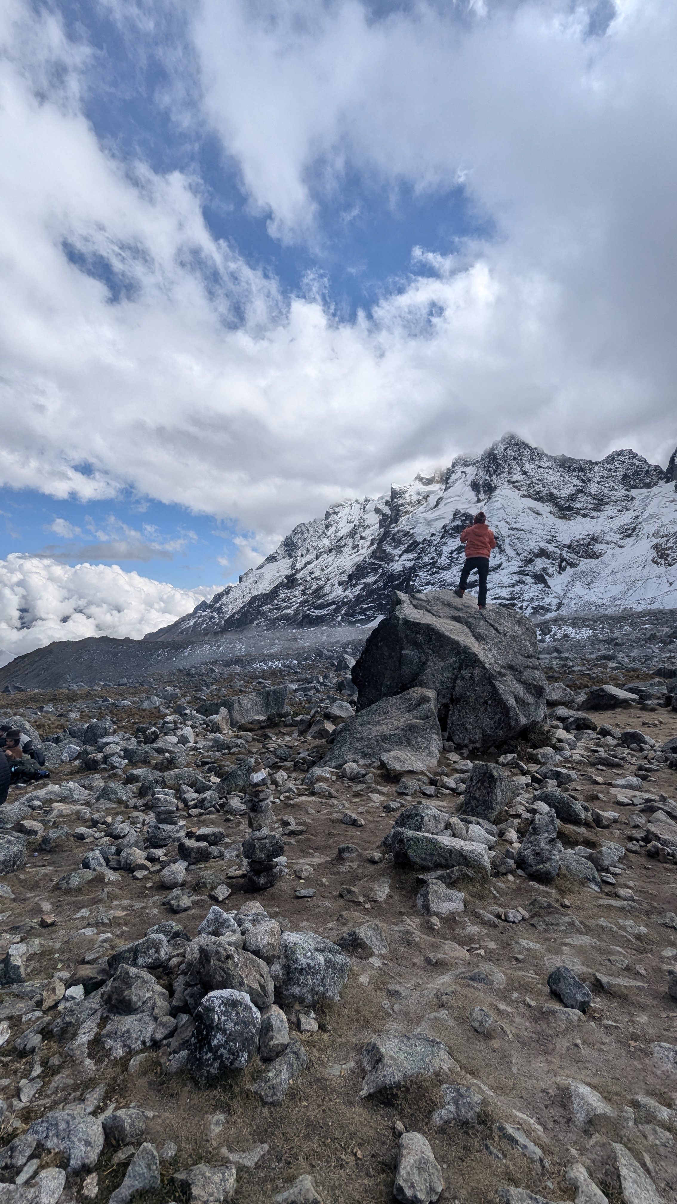 Once we reached the pass we thought the clouds would burn off but we were stuck waiting around (with about 40 other folks) to see if the view would open up. Just as we were deciding to head back–it’s not a great idea to stay at high elevations for a long time–our guide began passing out perfect coca leaves. Not to eat but for a short cultural ceremony to thank Pachamama (Earth Mother) and blow our spirits into the mountains. We then created a tiny rock cave and placed our leaves inside. Like magic, the clouds parted and we were able to see the Salkantay glacier and mountains that encapsulated it.