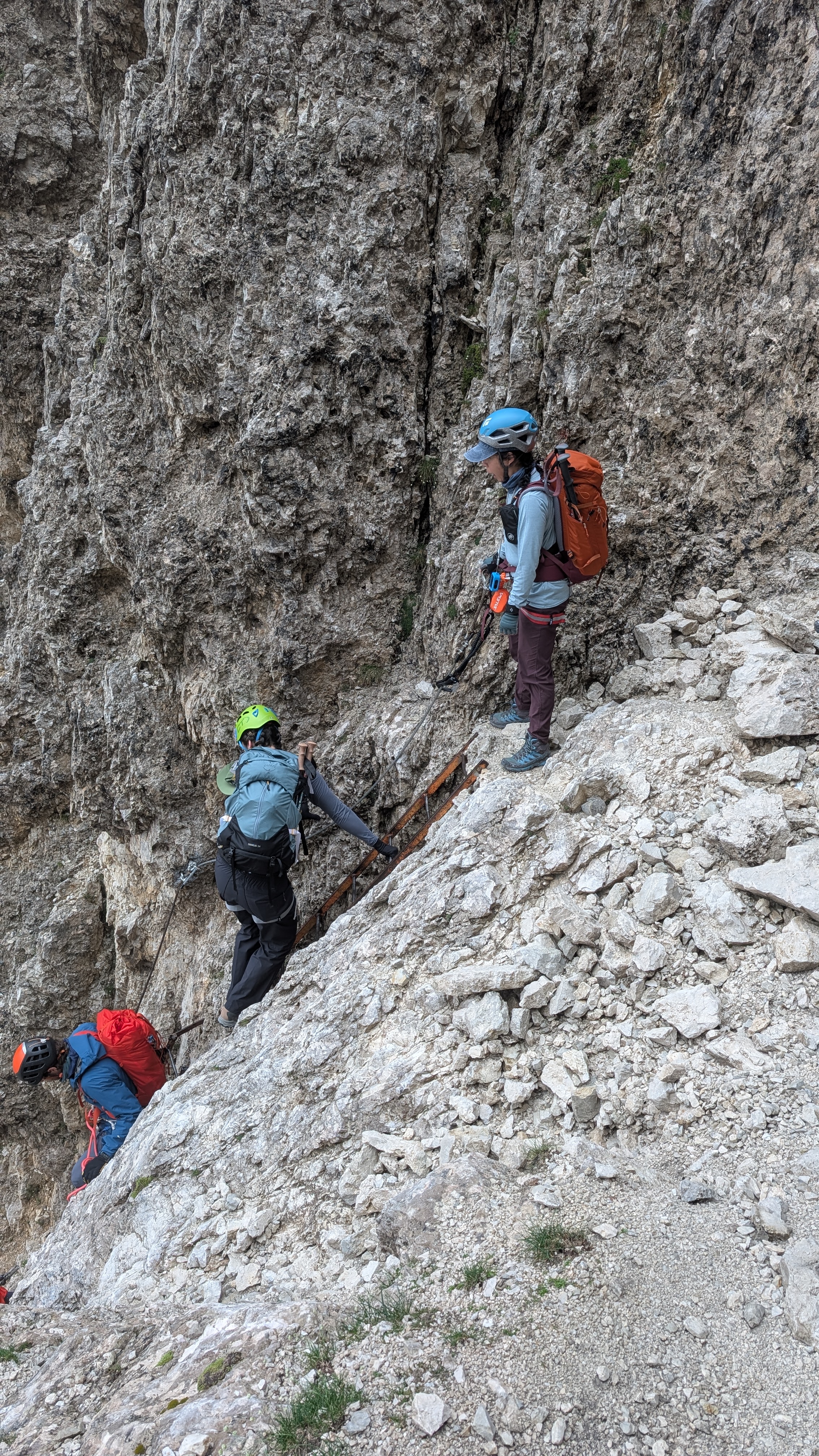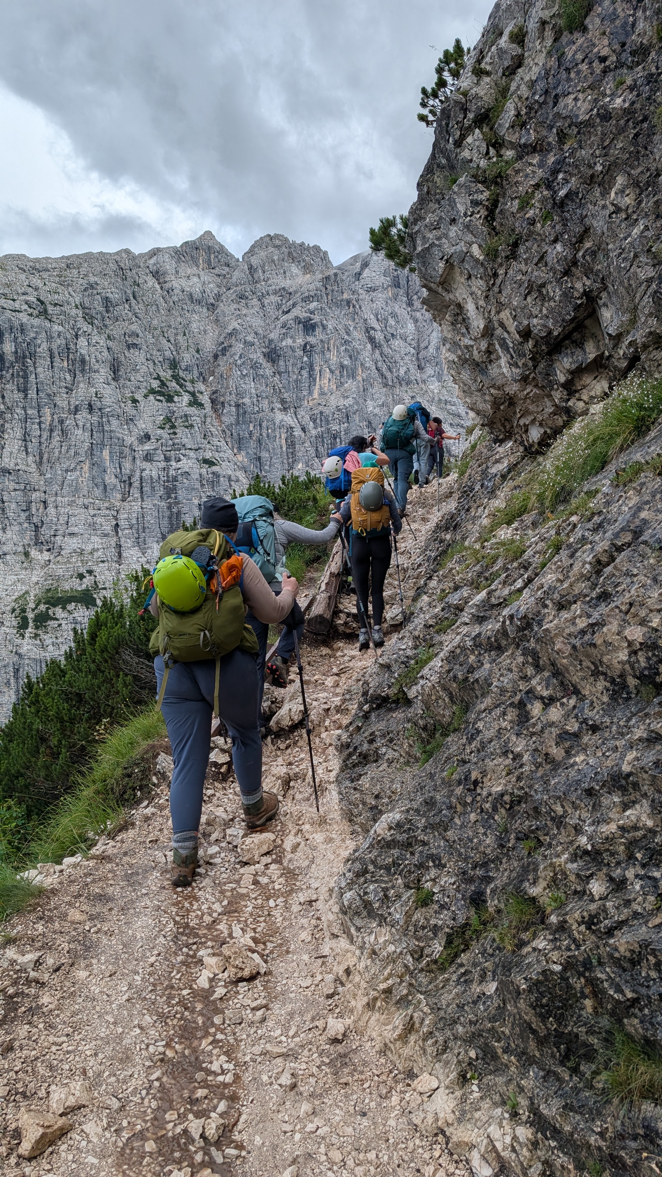 July 8 – We had to make a hard decision for day 4. Either do the most difficult via ferrata and steep scree hike; or hike down, take a bus, and hike again to the next location. Under the best circumstances this would be a really difficult day but the weather was also not on our side, so we opted for the safer option and skipped the via ferrata, and we still ended up hiking up to the refugio in the rain 🌧️. What we didn’t anticipate was missing the bus and being stuck on the side of the road for hours. One thing about travel is you better be flexible enough for the unexpected.
